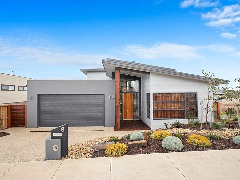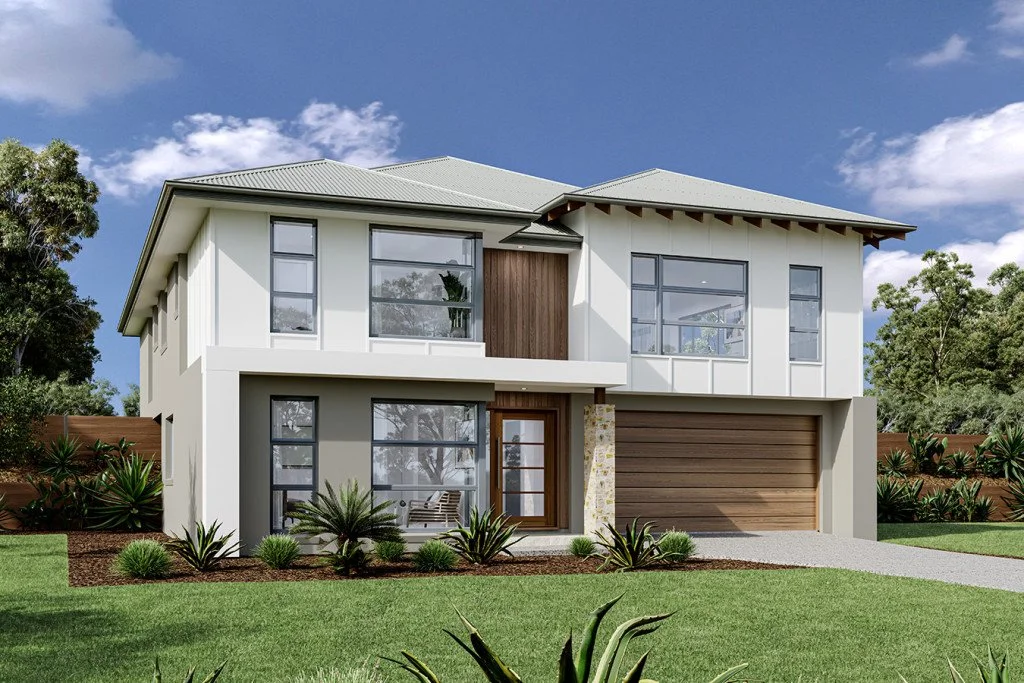 This modern two-storey home has been designed for a sloping block whereby the block slopes up from the road and has views to the front. It features timber posts, open plan living, a picture window and skillion rooflines invoking a coastal feel. The upstairs design takes advantage of frontal views and key solar orientation. Upstairs is inclusive of a lavish open plan living area with connecting deck, raked ceiling, ample storage, master bedroom suite with secondary bedroom and laundry. A concise ground floor with double garage, family bathroom and versatile third bedroom or at home office allows owners to be flexible with the way they live.
